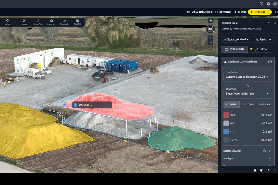 - Use visual tools to validate measurements and share results easily making material inventory tracking simpler, safer, and more transparent — perfect for bulk materials, or earthworks management.